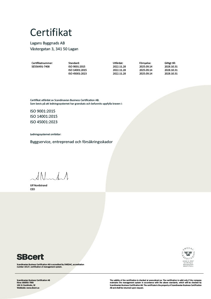 Lagans Byggnads AB är certifierade enligt internationellt erkända ISO-standarder genom det ackrediterade certifieringsorganet SBcert. Detta innebär att vårt arbete kontinuerligt granskas av en oberoende part för att säkerställa att vi uppfyller högt ställda krav på kvalitet, miljö och arbetsmiljö.
